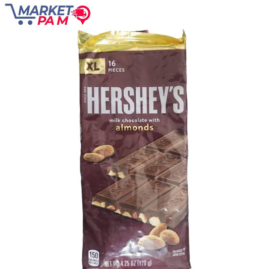 XL 16 PIECES HERSHEY'S milk chocolate with almonds 150 CALORIE PER & PAELLES NET W 4.25 OZ (120 g) ENLARGED T SHOW DETAL